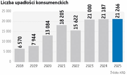 Liczba bankructw konsumenckich po kilku latach znaczących wzrostów ustabilizowała się, choć na bardzo wysokim poziomie. W minionym roku ogłosiło upadłość 21 266 osób, o 79 więcej niż w 2024 r. Ich wierzyciele stracili 287 mln zł. W drugiej połowie ub.r. dynamika ogłaszanych upadłości była jednak bardzo duża. Na to nakładają się nie najlepsze nastroje konsumentów. Jak podaje GUS, w grudniu bieżący wskaźnik ufności konsumenckiej (BWUK), opisujący obecne tendencje konsumpcji indywidualnej, wyniósł minus 9,9. Pod koniec roku pogorszyły się oceny przyszłej sytuacji finansowej gospodarstwa domowego, przyszłej sytuacji ekonomicznej kraju oraz możliwości dokonywania ważnych zakupów. Podsumowując, druga połowa roku nie nastraja jeszcze do optymizmu.