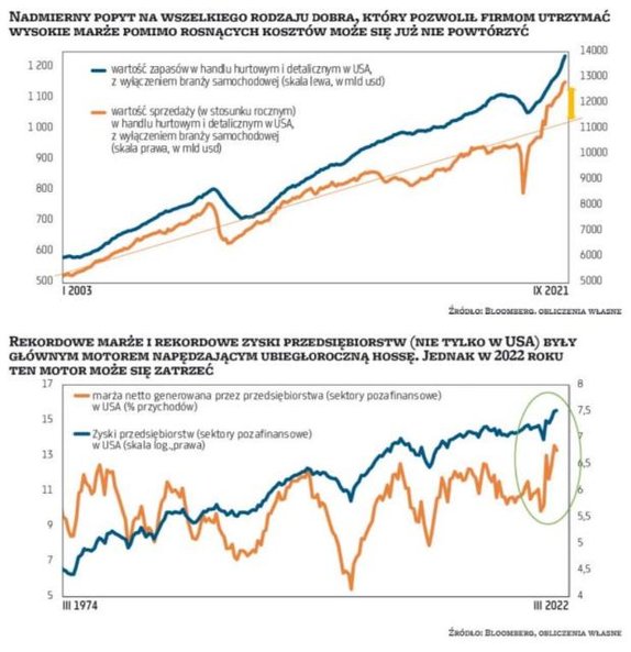 Drugi, bardziej prawdopodobny, scenariusz zakłada, że trendy, z jakimi mieliśmy do czynienia na różnych klasach aktywów oraz w gospodarce w minionym roku, mogą się odwrócić. Inwestorzy mogą zacząć (np. w drugiej połowie roku) dyskontować przejście z okresu stagflacji (roku 2022) w recesję (roku 2023), a tym samym z hossy w bessę, z najwyższej od dekad inflacji w niemal deflację. Bardzo silny wzrost zysków oraz rekordowe marże generowane przez przedsiębiorstwa na całym świecie usprawiedliwiały w dużej mierze ostatnią falę postpandemicznej hossy. Coraz bardziej widoczne symptomy globalnej stagflacji wskazują jednak na ryzyko spadku zyskowności giełdowych spółek.