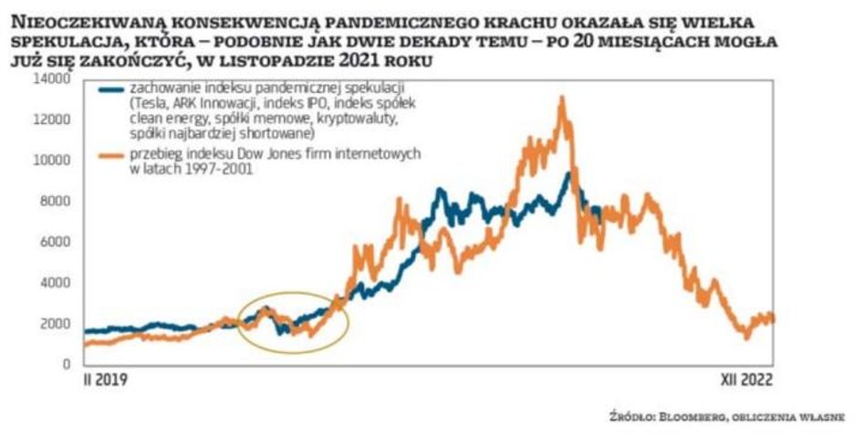 Zakładam, że w pierwszej połowie 2022 r. inwestorzy zaczną dostrzegać problem z perspektywą obniżenia się rentowności spółek, co w drugiej połowie roku może zostać wzmocnione obawami o przejście globalnej stagflacji w recesję. Patrząc na historyczne przykłady, czy to stagflacji lat 1989–1990, czy 2000–2001, a wreszcie lat 2007–2008, recesja wydaje się niemal nieuniknioną konsekwencją spowolnienia koniunktury w obliczu wszechobecnej presji inflacyjnej. Szukając najbardziej odpowiedniej analogii, trzeba sięgnąć do końca hossy lat 90. ubiegłego stulecia, której ostatnia, bardzo spekulacyjna w swej naturze odsłona rozpoczęła się tuż po krachu wywołanym kryzysem rosyjskim oraz upadkiem funduszu LTCM. Z podobnym zjawiskiem wszechobecnej spekulacji, której nie było przez pierwsze dziesięć lat hossy, mamy do czynienia od pandemicznego krachu.