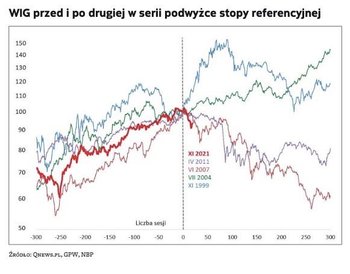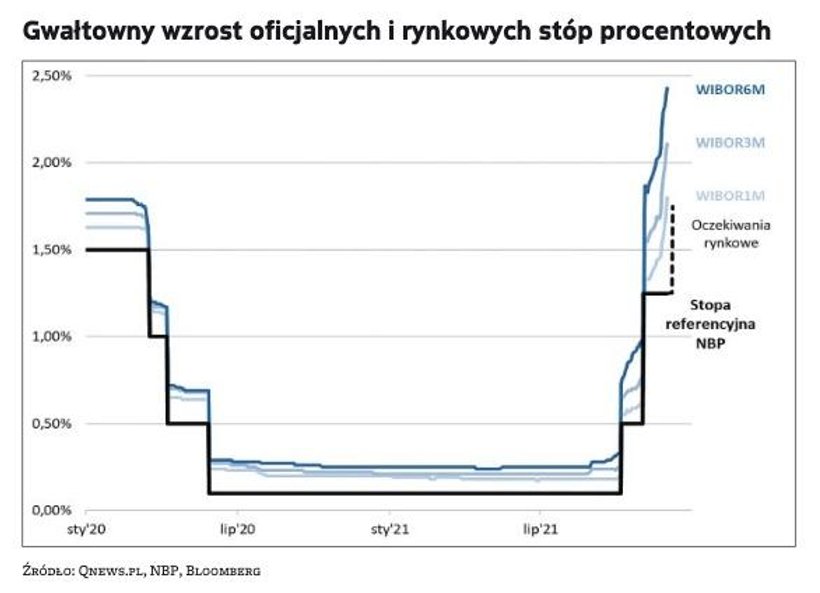 O ile ubiegły rok stał pod znakiem gwałtownego ścięcia stopy referencyjnej do niemal zera przez Radę Polityki Pieniężnej, o tyle końcówka bieżącego roku odwróciła ten trend o 180 stopni. Sam fakt, że stopy rosną po raz pierwszy od ponad dziewięciu lat, każe się bacznie przyglądać potencjalnym efektom tych decyzji. Tym bardziej że wszystko wskazuje na to, iż dotychczasowe dwie podwyżki to jeszcze nie koniec zacieśniania. Ekonomiści powszechnie spodziewają się kolejnej, trzeciej, podwyżki na posiedzeniu 8 grudnia. Notowania kontraktów FRA implikują dalsze ruchy stopy referencyjnej w górę, aż do 3 proc. w połowie 2022 r. wobec 1,25 proc. po listopadowej podwyżce.