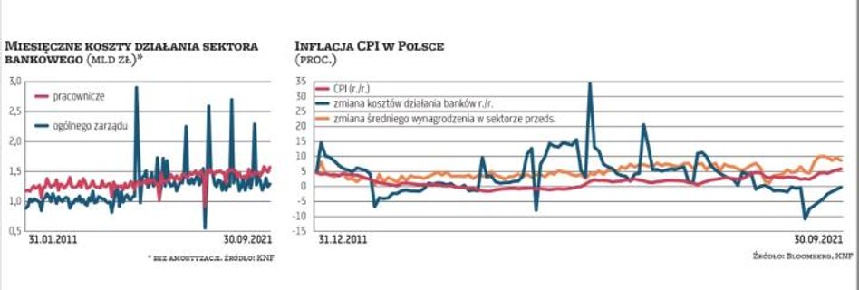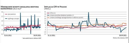 Wzrost wydatków operacyjnych banków widoczny jest już teraz. W całym sektorze w samym III kwartale wydatki tego typu (bez amortyzacji) urosły rok do roku o ponad 5 proc., a w niektórych bankach tempo zbliżało się nawet do 10 proc. Tak było na przykład w PKO BP, głównie ze względu na rosnące koszty pracownicze, które zwiększyły się wskutek podwyżki wynagrodzeń i zwiększeniu rezerw na bonusy. Ten drugi czynnik to skutek bardzo dobrej sprzedaży kredytów detalicznych w tym roku, co kontrastuje ze słabym 2020 r., gdy niska sprzedaż z powodu pandemii oznaczała mniejsze premie i bonusy dla pracowników. Teraz sytuacja się odwróciła. Bartosz Drabikowski, wiceprezes PKO BP, mówił na ostatniej konferencji, że koszty będą w przyszłym roku rosły, szczególnie te pracownicze. Zarząd mBanku, którego wydatki operacyjne w III kwartale urosły rok do roku o prawie 9 proc., podał, że w najbliższych kwartałach będzie obserwował presję płacową, ale ogólne koszty działania pozostaną pod kontrolą.