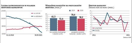 Koszty pracownicze stanowią około połowy wydatków operacyjnych banków. Średnie wynagrodzenie w sektorze przedsiębiorstw rośnie w ostatnich latach po około 6–8 proc. rok do roku, więc silnie to wpływa na wzrost kosztów pracowniczych kredytodawców. Muszą oni dodatkowo zwiększać zatrudnienie wysoko opłacanych specjalistów od IT czy regulacji, o których muszą rywalizować także z innymi branżami. Kredytodawcy starają się neutralizować to, redukując zatrudnienie (głównie w oddziałach): przez dziewięć miesięcy tego roku w sektorze ubyło 5,8 tys. etatów, czyli liczba zatrudnionych zmalała o 4 proc. Od końca 2010 r. etatów ubyło 33,7 tys. (spadek o 19 proc.). Banki starają się optymalizować koszty, wprowadzając programy oszczędnościowe, jak ostatnio np. Alior, czy nadrabiając zaległości w zakresie restrukturyzacji zatrudnienia, jak np. Pekao.