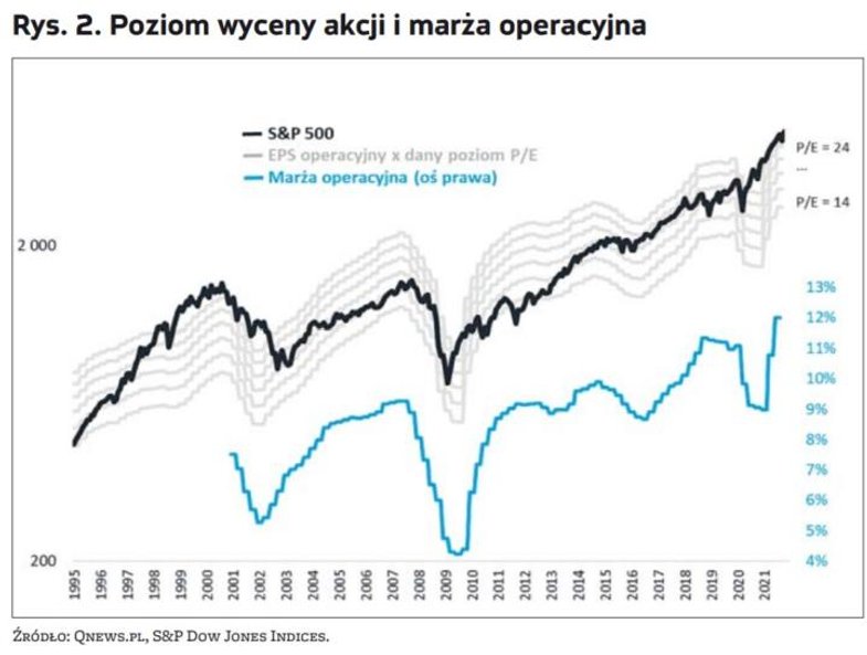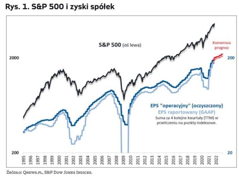 Na pierwszym wykresie pokazujemy S&P 500 na tle zysków zaprezentowanych w formie bezpośrednio porównywalnej z samym indeksem (wyrażone są w punktach indeksowych i liczone jako suma z czterech kolejnych kwartałów). Już w pierwszej chwili w oczy rzuca się fakt, że chociaż tempo obecnej fali hossy na Wall Street jest imponujące, to jednak tempo poprawy wyników również jest spektakularne. III kwartał br. był zarazem trzecim kolejnym kwartałem dynamicznego wzrostu EPS (zysku na akcję). Od pandemicznego dna urósł on już o ponad 80 proc. w przypadku zysku raportowanego i 55 proc. w przypadku z natury mniej wahliwego wyniku operacyjnego (częściej stosowanego w analizach). Podkreślmy, że taka dynamika przerosła wszelkie oczekiwania z okresu po pandemicznym szoku, z wiosny 2020.