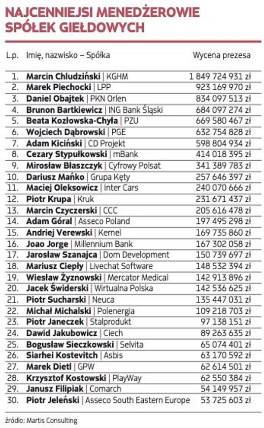 Dotarliśmy do najnowszej edycji raportu firmy Martis Consulting „Wycena polskich menedżerów". Wartość dziesięciu najcenniejszych prezesów jest zdecydowanie wyższa niż rok temu. Najmocniej statystykę podbija jedna osoba: Marcin Chludziński z KGHM. Przypada na niego aż 1,85 mld zł.