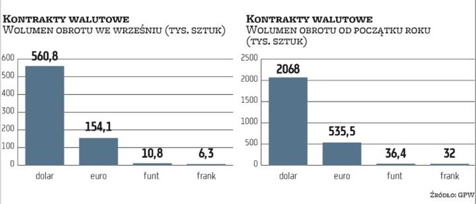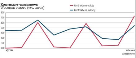 Oczywiście trzeba wziąć poprawkę na to, że samo porównywanie wolumenów może dawać błędny obraz rynku. Pod względem wartości obrotów to wciąż kontrakty na indeksy biją na głowę inne pochodne, co wynika z wielkości poszczególnych futures. We wrześniu na rynku kontraktów na indeksy obroty wyniosły 25,4 mln zł, podczas gdy na waluty było to niecałe 3 mln zł.