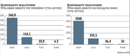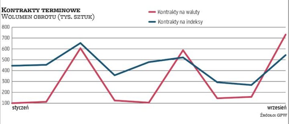 Niemniej jednak rosnące zainteresowanie pochodnymi na waluty jest sytuacją co najmniej zaskakującą. Ale patrząc na statystyki giełdowe, w oczy rzuca się jeszcze jeden fakt. Wzmożony handel tymi instrumentami obserwujemy przede wszystkim w miesiącach wygasania kontraktów terminowych. W tym roku mowa jest więc o marcu, czerwcu i właśnie o wrześniu. W pozostałych okresach handel nimi wyraźnie kulał i nawet pod względem wolumenów był wyraźnie mniejszy niż w przypadku futures na indeksy.
