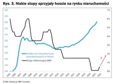 Porównując ceny nieruchomości i poziom stóp procentowych, nietrudno odnieść wrażenie, że trend wzrostowy, który zaczął powoli rodzić się w okolicach jeszcze 2014 roku (czy ktoś pamięta jeszcze, że wcześniej przez ponad pięć lat ceny spadały?), został nieprzypadkowo mocno wsparty przez odbywający się równolegle stopniowo spadek kosztów pieniądza, którego finałowa odsłona nastąpiła wraz z wybuchem pandemii. Nietrudno jednocześnie odnieść wrażenie, że z kolei wcześniejsze podwyżki stóp (2011–2012, 2007–2008) przyczyniły się ostatecznie do trendu spadkowego cen nieruchomości.