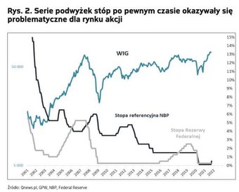 Do ustanowienia szczytu WIG-u na początku 2018 przed późniejszą kilkudziesięcioprocentową przeceną niepotrzebne okazały się podwyżki stóp na rodzimym podwórku (bo te stały w miejscu), ale wystarczyło (w uproszczeniu) podniesienie kosztów pieniądza w USA o nieco ponad 1 pkt proc. na przestrzeni ok. dwóch lat. Górka na wiosnę 2011 przed odchudzeniem wartości WIG-u o ponad jedną czwartą została z kolei poprzedzona podniesieniem stóp w Polsce łącznie o 1 pkt proc. (wtedy z kolei Fed nic nie robił). Zdecydowanie najostrzejszej serii podwyżek potrzeba było natomiast do zabicia wielkiej hossy lat 2003–2007, ale z kolei najbardziej opłakane okazały się ostatecznie skutki tego zaostrzenia, kiedy w końcu zaczęło działać. W tamtym epizodzie definitywny szczyt WIG-u został ustanowiony dopiero po podniesieniu stóp w USA o ponad 4 pkt proc. i rozpoczęciu serii podwyżek przez rodzimą RPP.
