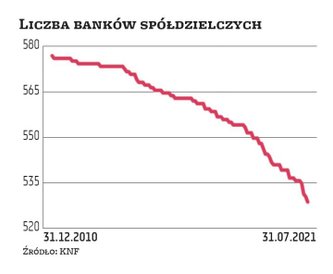 Sektor banków spółdzielczych jest bardzo rozdrobniony: przy aktywach rzędu blisko 175 mld zł istnieje aż 521 banków tego typu (dla porównania: komercyjnych jest tylko 30, ale mają aż 2,25 bln zł aktywów). Eksperci nawołują do konsolidacji spółdzielczych kredytodawców, ale postępuje ona bardzo wolno. Przez ostatnie 12 miesięcy ubyło tylko 12 banków tego typu, w zdecydowanej większości właśnie dzięki fuzjom. Przez pięć lat ich liczba zmalała o 41, przez dekadę zaś o 55 (w tym było parę upadłości). Ostatnio jednak pojawiła się nadzieja, że ten proces przyśpieszy, bo same banki spółdzielcze zaczynają się na nie dobrowolnie decydować, a nie dopiero w obliczu nadciągającej upadłości lub presji nadzoru. Na przykład wiosną przeprowadzono fuzję obejmującą cztery banki z województwa łódzkiego należące do SGB. Mimo że ogólna sytuacja kapitałowa tego sektora jest dobra, to wciąż sporo kredytodawców boryka się z niskimi kapitałami, które w dodatku trudno im podnieść (z powodu małej rentowności i małej chęć udziałowców na dokładanie do biznesu). Problem mają głównie mniejsze banki. Szczególnie narażone mogą być te, które są poza zrzeszeniami i systemami ochrony instytucjonalnej (tzw. IPS), bo pozbawione są możliwości szybkiego wsparcia z IPS. Jest ich jednak niewiele – na koniec marca 12. Z kolei 325 banków spółdzielczych należało do systemu ochrony IPS BPS, a 192 do IPS SGB. MR