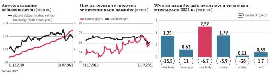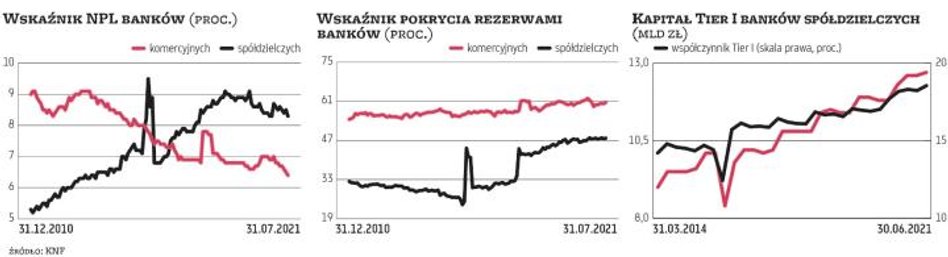 Odpisy kredytowe spadają w tym roku w całym sektorze, co ma duży wpływ na poprawę wyników banków. Rezerwy kredytowe w bankach spółdzielczych zmalały po siedmiu miesiącach o prawie 40 proc., a w komercyjnych o 50 proc. O ile nie dziwi to w przypadku tych drugich, które w ubiegłym roku zawiązywały wielkie rezerwy na skutki pandemii (chodzi o kwotę około 3,5 mld zł), o tyle w spółdzielczych jest to zaskakujące, bo już w ubiegłym roku ich rezerwy malały. Dodatkowo udział kredytów zagrożonych w sektorze spółdzielczym jest od lat wyższy niż w komercyjnym (na koniec lipca wyniósł odpowiednio 8,3 proc. i 6,4 proc., im niższy, tym zdrowszy portfel), a na dodatek wskaźnik pokrycia rezerwami tych zagrożonych kredytów jest niższy (wynosi niespełna 48 proc. w spółdzielczych w porównaniu z 61 proc. w komercyjnych, im wyższy, tym większe rezerwy odłożone na wypadek pogorszenia spłacalności). To może stawiać pod znakiem zapytania jakość wyników spółdzielców i zdolność do podtrzymania dodatnich wyników w razie spowolnienia gospodarczego albo istotnego wzrostu stóp procentowych (najgorszy scenariusz to stagflacja), które skutkowałoby pogorszeniem spłacalności kredytów i koniecznością tworzenia nowych rezerw. Pocieszające jest to, że sytuacja kapitałowa tego sektora jest generalnie dobra, z nawiązką spełniane są wymogi regulacyjne, więc jest zdolność do absorbcji umiarkowanych strat. Problem w tym, że sytuacja poszczególnych banków jest bardzo zróżnicowana i część z nich już ma kłopoty (w ostatnich latach było parę upadłości i dwie przymusowe restrukturyzacje spółdzielczych kredytodawców).