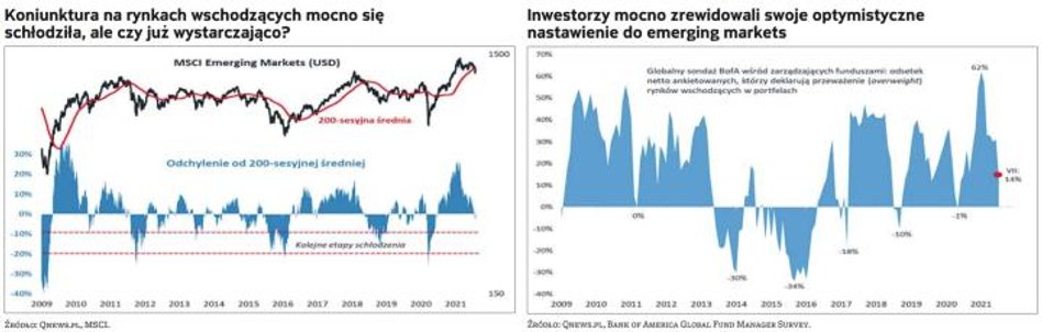 Innymi słowy, po euforycznej ocenie perspektyw rynków wschodzących nie ma już ani śladu. Jak zwykle w takiej sytuacji można się jednak zastanawiać czy po silnym przegrzaniu nie powinno mieć miejsca równie silne (czyli jeszcze silniejsze niż obecnie) schłodzenie. Przykładowo we wspomnianym sondażu BofA w zasadzie regułą było to, że odsetek zarządzających deklarujących przeważenie EM w portfelach spadał poniżej zera (tak było np. w maju 2020 r., lipcu 2018 r., styczniu 2017 r.). Wspomniany lipcowy spadek do +14 proc. nie spełnia jeszcze tego kryterium.