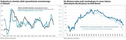 Do zmiany nastawienia do emerging markets na jednoznacznie entuzjastyczne zniechęca póki co jeszcze jedna kwestia. Chodzi znów o Chiny, i nie tyle o regulacyjne zapędy tamtejszych władz, ile raczej o dużo ważniejszą sprawę: trendy monetarne. Powracamy do opisywanego już wielokrotnie tematu tzw. chińskiego impulsu kredytowego (czyli tempa przyrostu kredytów względem PKB). Jak pokazujemy na kolejnym wykresie, zadyszka rynków wschodzących może być interpretowana jako efekt osłabiania się chińskiego impulsu. Na obecnym etapie szacujemy, że czynnik ten powinien negatywnie oddziaływać na roczną dynamikę MSCI EM przynajmniej do końca roku. Jeśli traktować ten wykres w sposób najbardziej dosłowny, to 12-miesięczna zmiana indeksu w grudniu powinna zejść w okolice zera. To z kolei oznaczałoby z jednej strony, że do końca roku sam indeks nie ma przed sobą w zasadzie potencjału wzrostowego, a z drugiej, że nie ma też większego potencjału spadkowego (bo już teraz jest w okolicach zera, licząc od początku roku). Na razie za wcześnie natomiast, by prognozować na tej podstawie rok 2022 (obraz będzie się klarował wraz z kolejnymi odczytami chińskiego impulsu).