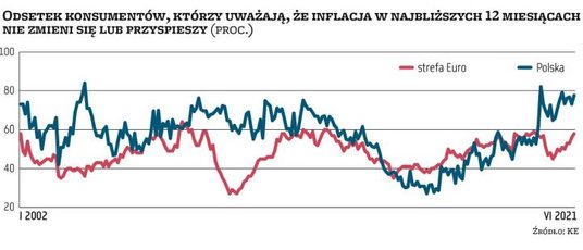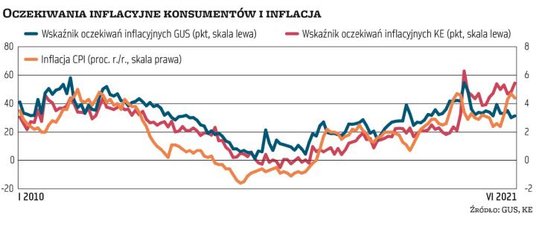 Przytoczone wyżej dane pochodzą z badań Komisji Europejskiej (w praktyce w Polsce realizuje je GfK Polonia). Na ich podstawie KE oblicza wskaźnik oczekiwań inflacyjnych, który w czerwcu wzrósł do 54,4 pkt z 48,4 pkt w maju. Wyżej był tylko dwa razy w sięgającej 2001 r. historii: w kwietniu 2020 r. i w kwietniu 2004 r. Ale na tej podstawie, wbrew pozorom, nie da się jednoznacznie powiedzieć, czy oczekiwania inflacyjne są wysokie, czy niskie. Interpretacja zależy bowiem od poziomu inflacji, przy którym te oczekiwania są formułowane. Przykładowo, w kwietniu 2004 r. inflacja, mierzona wskaźnikiem cen konsumpcyjnych (CPI), wynosiła zaledwie 2,2 proc. rocznie. Mogła wzrosnąć o ponad 1 pkt proc. lub pozostać na tym samym poziomie – zgodnie z oczekiwaniami większości konsumentów – i ciągle byłaby zgodna z celem inflacyjnym NBP. Dzisiaj takie same oczekiwania, gdyby miały okazać się celne, zwiastowałyby inflację na poziomie co najmniej 4,7 proc. rocznie, czyli wyraźnie powyżej nie tylko celu NBP, ale nawet górnej granicy pasma dopuszczalnych odchyleń od tego celu.