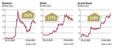 Pozytywnie wyróżniły się walory Aliora, który po długim okresie zniechęcenia wrócił w końcu do łask inwestorów, co pozwoliło kursowi z zapasem odrobić straty z 2020 r. – Wysoki wzrost notowań banku to skutek niezłych wyników. Tarcze dla firm oddaliły niebezpieczeństwo rezerw portfela korporacyjnego, bank nie posiadał kredytów frankowych, więc ominęły go problemy z tym związane. Obecnie jest notowany przy jednym z najniższych wskaźników w sektorze, przy dość dobrej dynamice (choć spadającej) wolumenów. Tym można tłumaczyć jego popularność wśród inwestorów – wyjaśnia Marcin Materna, szef analityków Millennium DM. Inwestorzy mocno liczą na poprawę tegorocznych rezultatów, czemu sprzyjać mają powrót gospodarki na ścieżkę wzrostu, spadek kosztów ryzyka i realizowane przez bank inicjatywy oszczędnościowe.