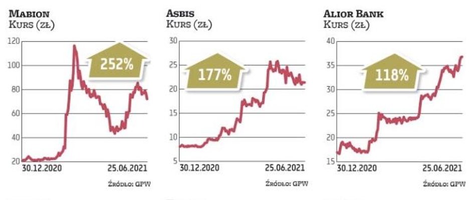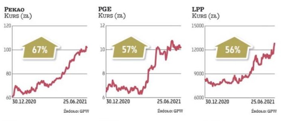 W tym roku można było sowicie zarobić, zarówno mając w portfelu akcje potentatów z indeksu WIG20, jak i średnich i małych spółek. Wśród największych firm najbardziej okazałą stopę zwrotu przyniosły akcje Pekao, zyskując ok. 67 proc. Bank ten atrakcyjnie wypada na tle branżowych konkurentów, co zostało docenione przez rynek. – Wśród czynników stwarzających presję na jego wycenę w 2020 r. były m.in. gorsze niż spodziewane przychody zarówno odsetkowe, jak i z opłat i prowizji, przejęcie Idea Banku, z którym Bank Pekao jak na razie radzi sobie dobrze, a także potencjalne ryzyko przejęcia Alior Banku, które wydaje się oddalać wraz z rosnącą wyceną tego drugiego – zauważa Marta Czajkowska-Bałdyga, analityk Haitong Banku. Istotnym atutem Pekao jest perspektywa wypłaty dywidendy. – Bank naszym zdaniem spełnia wymogi rekomendacji KNF, aby wypłacić zgodnie z uchwałą WZA 75 proc. zysku z 2020 r. (co daje 3,21 zł na akcję) – ocenia ekspertka. Nie bez znaczenia jest też fakt, że wyniki Pekao są bardziej wrażliwe na wzrost rynkowych stóp procentowych, co przy rosnącej presji inflacyjnej, mającej wpływ na spekulacje rynku co do stóp RPP, również pozytywnie przekłada się na jego wycenę na GPW.
