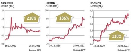 Do łask wróciły w tym roku akcje Erbudu, za którym przemawiają poprawiające się wyniki. – Spółka ma zbudowany silny i duży portfel zamówień na ten rok, co będzie wspierać wyniki w kolejnych kwartałach. Dodatkowo popyt w zakresie zwłaszcza energii odnawialnej pozostaje silny. Natomiast kluczowym czynnikiem mogą się okazać osiągane marże. W tym zakresie, zwłaszcza w generalnym wykonawstwie, ryzykiem są rosnące ceny surowców i materiałów – wskazuje Emil Łobodziński, doradca inwestycyjny w BM PKO BP.