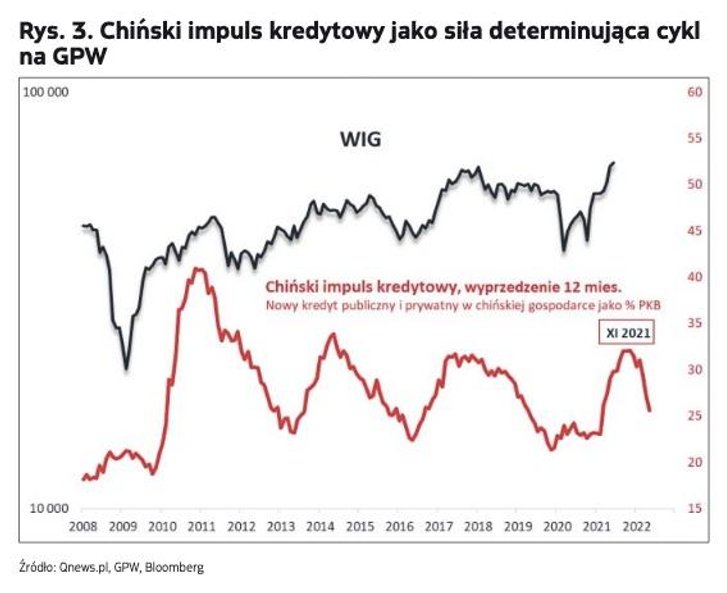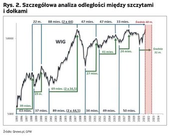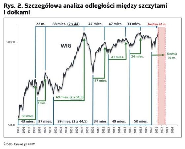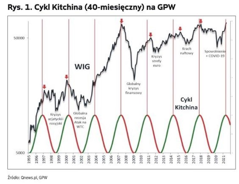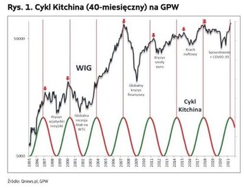 W tym temacie nieuchronnie powracamy do tzw. cyklu Kitchina, czyli koncepcji, wg której kolejne wzloty i upadki WIG-u następują na przemian w powtarzającym się nieustannie schemacie obejmującym 40 miesięcy. Kwestię tę poruszamy od lat regularnie i na ogół jest to ważna wskazówka co do losów koniunktury na GPW. Co prawda w latach 2019–2020 koncepcja ta rozczarowała, dając zdecydowanie przedwcześnie sygnał ukształtowania się dołka, który w rzeczywistości miał miejsce jakieś pół roku później, ale częściowo można to usprawiedliwiać nietypowym czynnikiem w postaci pandemii (jest tu wszakże pewna nauczka na przyszłość – dołek cyklu można rozpoznać po gwałtownej, panicznej wyprzedaży). Jednak tuż po pandemicznym szoku sytuacja zaczęła błyskawicznie wracać do normy. Wnioski, które wysnuwaliśmy na podstawie cyklu Kitchina po koronakrachu, okazały się trafne.