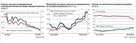 Bank centralny zwraca uwagę, że wysoki udział papierów skarbowych i gwarantowanych przez Skarb Państwa w aktywach sektora bankowego zwiększa wrażliwość banków na potencjalne szoki wywołane czynnikami rynkowymi. Jednak na razie sytuacja jest dobra. Symulacje o charakterze testów warunków skrajnych, przeprowadzone na podstawie danych z grudnia 2020 r., pokazują, że dopiero ok. 15-proc. spadek wartości papierów skarbowych i gwarantowanych przez Skarb Państwa znajdujących się w portfelu banków mógłby spowodować naruszenie norm kapitałowych z filarów I i II (w zdecydowanej większości przecena obligacji nie miałaby wpływu na rachunek wyników banków, lecz wpłynęłaby na sytuację kapitałową). To naruszenie norm kapitałowych dotyczyłoby tylko banków mających łącznie 9-proc. udział w aktywach krajowego sektora bankowego. Historyczna zmienność rentowności obligacji skarbowych wskazuje, że prawdopodobieństwo wystąpienia tak głębokiego spadku wyceny papierów skarbowych jest zdaniem NBP niskie. Ale nałożenie się kilku szoków (jak np. w przypadku szoku w postaci pandemii oraz ryzyka prawnego związanego z mieszkaniowymi kredytami walutowymi) może sprawić, że także mniejsza skala spadku cen obligacji miałaby niekorzystny wpływ na spełnianie wymogów kapitałowych przez część banków.