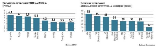 W naszym modelu uwzględniliśmy: dane o PKB za 2020 r. i prognozy PKB na 2021 i 2022 r. przygotowane przez Międzynarodowy Fundusz Walutowy, jego prognozy dotyczące stopy bezrobocia na 2021 r., dane o PKB na głowę (z uwzględnieniem parytetu siły nabywczej) oraz o tym, jak zmieniały się główne indeksy giełdowe w poszczególnych krajach przez ostatnie 12 miesięcy. W fazie grupowej przyznawaliśmy punkty dwóm najlepszym „drużynom" w każdej z kategorii. W przypadku remisów decydowała wielkość nominalnego PKB. W przypadku Anglii, Szkocji i Walii, wobec braku odrębnych danych w niektórych kategoriach, stosowaliśmy czasem dane dla całej Wielkiej Brytanii (nie ma np. odrębnych indeksów giełdowych dla tych krain i odrębnych prognoz dla PKB, ale są np. dane o PKB na głowę). Polska w tym modelu jest najlepszą drużyną grupy E, w której na drugim miejscu znalazła się Szwecja, a na trzecim Hiszpania.