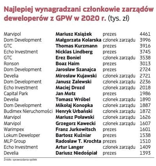 Stawkę otwiera Mariusz Książek, prezes Marvipolu. Otrzymał prawie 4,5 mln zł, o 42 proc. mniej niż rok wcześniej. Latem ub.r. doszło do zmiany polityki wynagradzania: od sierpnia prezes nie pobiera już żadnych premii, poprzestając na stałej pensji w wysokości do 50-krotności przeciętnego miesięcznego wynagrodzenia w sektorze przedsiębiorstw (w 2020 r. to 270 tys. zł). Z drugiej strony Marvipol przyjął politykę dywidendową. Książek, właściciel 71 proc. akcji, w 2020 r. otrzymał z tego tytułu nieco ponad 5 mln zł.