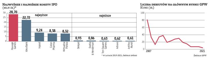 Wskaźnik ten jest jednak zaniżany przez wielkie oferty, gdzie uwidacznia się efekt skali (wartość oferty rośnie znacznie szybciej, niż zwiększa się koszt działań koniecznych do jej skutecznego przeprowadzenia). Mediana wskaźnika kosztów IPO do wartości oferty wyniosła w latach 2015–2021 około 4,1 proc. Najniższy, a więc spółka i brokerzy wykazali się największą efektywnością, był w Dino (0,2 proc.), którego oferta była warta blisko 1,66 mld zł, a koszty jej przeprowadzenia wyniosły tylko 3,7 mln zł. Niski wskaźnik miały też Artifex Mundi (0,6 proc.), Ten Square Games (0,7 proc.), Griffin Premium RE (1 proc.) czy Huuuge Games (1,7 proc.). Najwyższy wskaźnik zanotowały TXM i Gaming Factory (po około 14 proc.), których koszty oferty wyniosły po mniej więcej 2,8 mln zł przy ich wartości tylko po około 20 mln zł. W BoomBicie i Idea Banku wskaźnik ten wyniósł po 9 proc., w InPoście, BIK i Tower Investments po mniej więcej 7,5 proc.