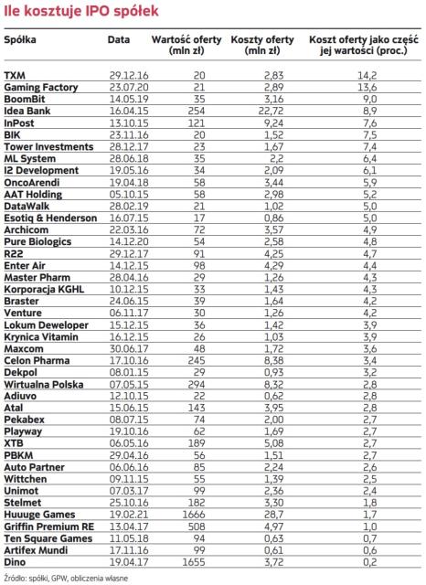 W ujęciu nominalnym największe koszty przeprowadzenia oferty poniosły Huuuge i Idea Bank, wyniosły odpowiednio aż 28,7 mln zł i 22,7 mln zł. Różnica między nimi jest taka, że oferta producenta gier była warta blisko 1,67 mld zł i pod względem efektywności znalazł się on w czołówce. Z kolei oferta banku opiewała tylko na 254 mln zł, więc wypadł słabo pod tym względem. Różnica między kolejnymi spółkami jest bardzo istotna – InPost zapłacił za IPO ponad 9 mln zł, a Celon Pharma i Wirtualna Polska po ponad 8 mln zł. Najmniej nominalnie za przeprowadzenie oferty wyłożyły Ten Square Games, Artifex Mundi i Adiuvo – zaledwie po 600 tys. zł.