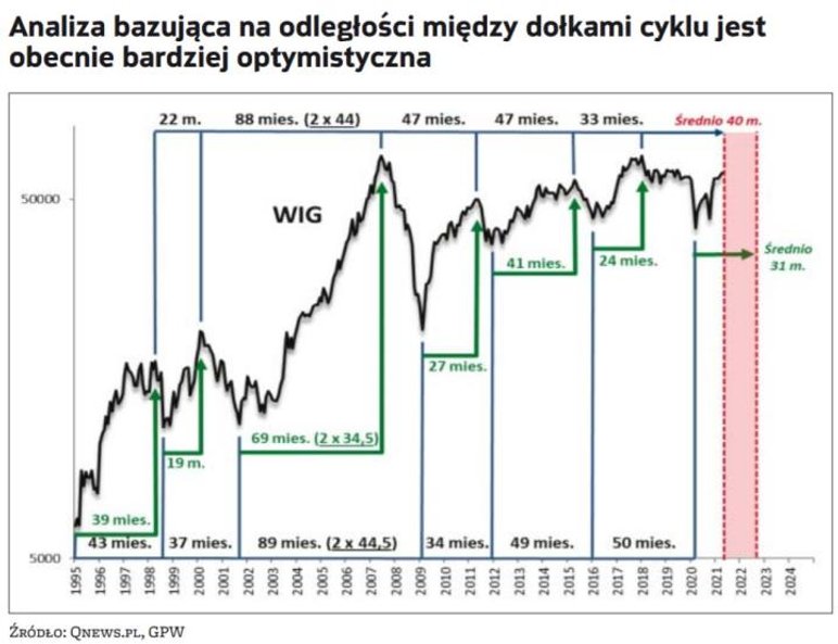 Do tych rozważań dorzućmy jeszcze jedną obserwację – w niemal wszystkich historycznych przypadkach każdy kolejny cykliczny szczyt był położony powyżej poprzedniej górki (z jednym jedynym wyjątkiem – położonego kosmicznie wysoko szczytu z 2007 roku nie udało się pokonać do tej pory). Jeśli ta reguła ma nadal obowiązywać, to byki na GPW nie powinny składać broni, zanim WIG pokona poprzednią górę ze stycznia 2018 roku na poziomie ok. 66 tys. pkt. Można zaryzykować tezę, że w tym cyklu krajowy indeks powinien więc sięgnąć po nowy rekord wszech czasów.