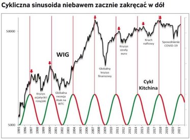 Za tym założeniem przemawiają zresztą inne fakty. Zauważmy, że w obecnym cyklu Kitchina ostatni dołek (III 2020) w rekordowym stopniu opóźnił się względem modelu, według którego powinien był mieć miejsce... siedem miesięcy wcześniej (VIII 2019 r.), za co obwiniać można oczywiście nietypowy czynnik w postaci pandemii.