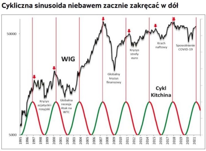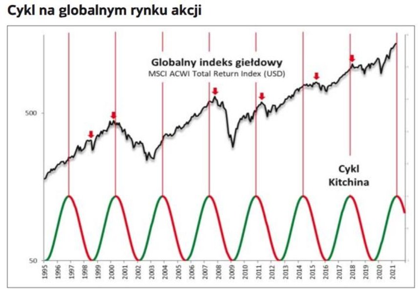 Zła wiadomość jest taka, że teoretycznie cykl Kitchina swój kolejny szczyt ma osiągnąć już lada chwila – w okolicach maja br. (co ciekawie komponuje się ze znaną z Wall Street maksymą „sell in May and go away"). Niestety, a może w tym przypadku raczej na szczęście, omawiany cykl nie jest perfekcyjną maszynerią, która zawsze idealnie wskazywała w przeszłości punkt kulminacyjny. Przykładowo, na przestrzeni ostatniego dziesięciolecia w każdym z trzech przypadków rzeczywisty szczyt WIG przed wejściem w fazę opadającą był mniej lub bardziej opóźniony w stosunku do modelowego cyklu. Najbliżej modelu była górka z początku 2018 roku, która spóźniła się zaledwie o dwa miesiące, z kolei największe opóźnienie – wynoszące aż 11 miesięcy – odnotowaliśmy w 2015 roku (na usprawiedliwienie trzeba dodać, że przez te 11 miesięcy WIG zyskał raptem 8 proc., koszt więc pozostania poza rynkiem był stosunkowo niewielki). Podobnie wyglądało to na globalnym rynku akcji.