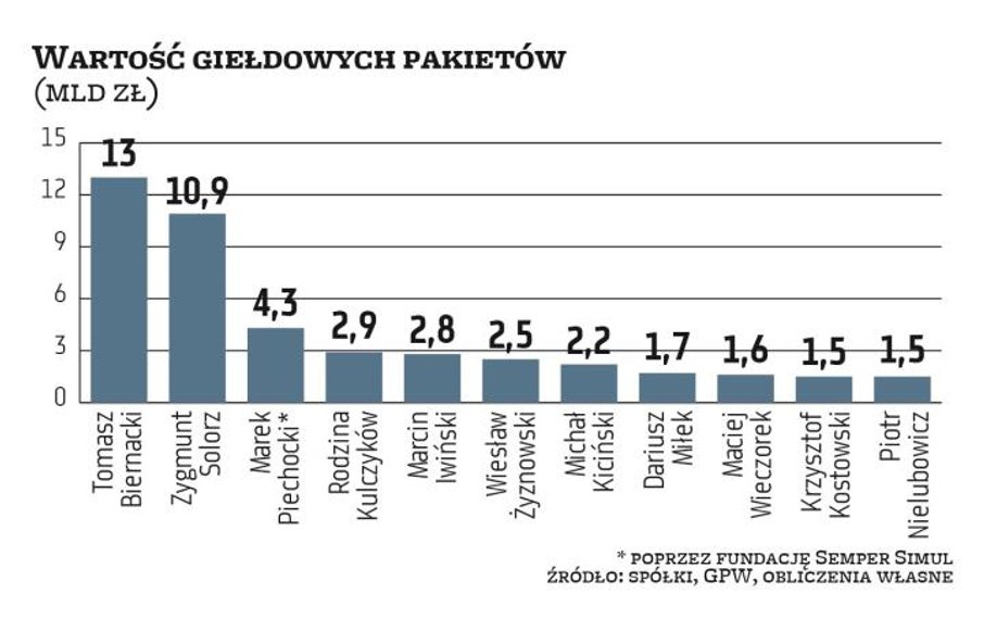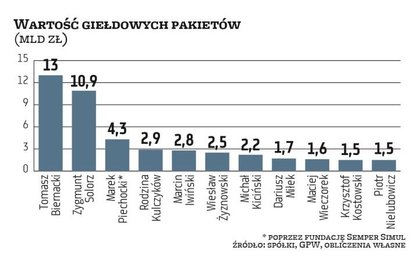 W naszym zestawieniu pod uwagę bierzemy tylko akcje spółek notowanych na GPW w Warszawie. Gdyby było inaczej, wówczas w zestawieniu najbogatszych, krajowych, prywatnych inwestorów pojawiłby się również Rafał Brzoska. Jest beneficjentem tegorocznej, udanej oferty publicznej InPostu. Spółka pod koniec stycznia zadebiutowała na rynku Euronext Amsterdam, a Brzoska awansował do pierwszej dziesiątki najbogatszych Polaków. Przy cenie akcji InPostu z otwarcia debiutanckiej sesji cały pakiet Brzoski był wart ponad 5,6 mld zł. To daje mu siódmą pozycję w pierwszej dziesiątce najbogatszych Polaków, uwzględniającej też aktywa niegiełdowe. Według zestawienia „Forbesa" listę otwiera Michał Sołowow, a za nim są Solorz, Jerzy Starak, Tomasz Biernacki, Dominika Kulczyk i Sebastian Kulczyk.