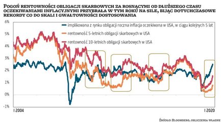 Choć wystromienie krzywej rentowności (wzrost rentowności obligacji długoterminowych w porównaniu z krótkoterminowymi) w USA było oczekiwane przez większość inwestorów już od dłuższego czasu, to szybkość ruchu, jaki się dokonał na rynku obligacji w ciągu ostatnich dwóch miesięcy, była zaskakująca. W normalnych czasach nominalna zmiana dochodowości obligacji pięcio- czy dziesięcioletnich rzędu 50 pkt bazowych byłaby zwykłym przejawem zmienności na rynku długu. Dziś jednak przy historycznie niskich stopach procentowych może być postrzegana jako znaczące zaostrzenie warunków monetarnych, mogące mieć wpływ na atrakcyjność wielu klas aktywów. Takiego skoku rentowności pięcio- czy dziesięcioletnich obligacji USA, jaki dokonał się od początku roku nie odnotowano (w tak krótkim czasie) od co najmniej 60 lat. Trzeba jednak przyznać, że ostatnia dekada, charakteryzująca się generalnie niskim poziomem stóp procentowych, obfitowała w okresy gwałtownego wzrostu rentowności obligacji. Tak było pod koniec 2010 r. czy podczas słynnego taper tantrum w 2013 r. oraz tuż po wygranych przez Donalda Trumpa wyborach, pod koniec 2016 r.
