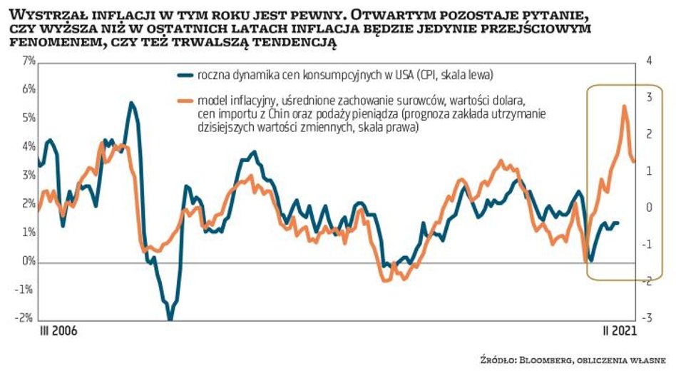 Czy dziś sytuacja może być inna? Rynek surowców sugeruje, że tak. Jeszcze pół roku temu nie było to takie oczywiste. Z dzisiejszej perspektywy trudno jest spojrzeć na dołki ustanowione w kwietniu ubiegłego roku przez wszystkie surowce jednocześnie inaczej niż jak na początek nowego długoterminowego trendu wzrostowego. Ujemne notowania kontraktów na ropę naftową w tamtym czasie można uznać za najbardziej spektakularne zwieńczenie trwającego od kwietnia 2011 r. trendu spadkowego cen surowców (choć sama ropa ustanowiła ówczesny szczyt na nieco niższym poziomie niż w 2008 r.). I to właśnie ropa naftowa była ostatnim surowcem, który nie zdołał do końca ubiegłego roku odrobić wszystkich postpandemicznych strat. Dopiero w lutym bieżącego roku notowania czarnego złota dokonały tego wyczynu i to w bardzo widowiskowy sposób, rosnąc o niemal 30 proc. w ciągu zaledwie pięciu tygodni (do szczytu z 5 marca). Ten jednoznacznie proinflacyjny czynnik, wraz z danymi sugerującymi siłę konsumpcji w USA, oznakami słabnięcia zimowej pandemii za oceanem (zakończenie lockdownu w Teksasie), a także przegłosowanie gigantycznego (1,9 bln USD) pakietu stymulacyjnego przez amerykański Kongres, przypieczętowały los rynku obligacji w ostatnich tygodniach. Słaby popyt na aukcji rządowych obligacji czy brak reakcji Fed na wystromienie krzywej rentowności oraz brak decyzji o przedłużeniu bankom w USA zezwolenia na wykluczenie obligacji skarbowych z obliczania wskaźników adekwatności kapitałowej jedynie przyspieszyły paniczną wyprzedaż. W rezultacie rentowność długoterminowych obligacji (powyżej dziesięciu lat) w USA powróciły do stanu sprzed pandemii, a uczestnicy funduszy dłużnych musieli pogodzić się ostatnio z niemałą stratą (funduszu ETF – TLT US spadł o 12 proc. od początku roku).