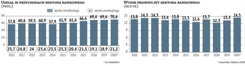Po trzech kwartałach tego roku wynik z opłat i prowizji polskich banków wyniósł 10,79 mld zł, czyli urósł o 8,7 proc. rok do roku (dla porównania wynik odsetkowy spadł w tym czasie o 3,3 proc., do 35,9 mld zł). To niezłe osiągnięcie, biorąc pod uwagę, że ze względu na pandemię i ograniczenie aktywności gospodarczej klientów słabiej wypadł II kwartał – w tym okresie wynik wzrósł rok do roku tylko o ponad 3 proc. w porównaniu z ponad 11 proc. wzrostu w I i II kwartale. Spadek wyniku odsetkowego i wzrost prowizyjnego spowodował, że pierwszy raz od lat zwiększył się udział tego drugiego w łącznych przychodach sektora bankowego: po dziewięciu miesiącach tego roku wyniósł 21,2 proc. wobec 18,9 proc. na koniec 2019 r. W poprzednich latach systematycznie spadał, m.in. z powodu niekorzystnych zmian regulacyjnych (cięcie stawek interchange, modyfikacje w zakresie księgowania niektórych przychodów prowizyjnych) czy za sprawą sporej konkurencji. Jeszcze w 2010 r. udział wyniku z opłat i prowizji w przychodach banków sięgał 25,7 proc.