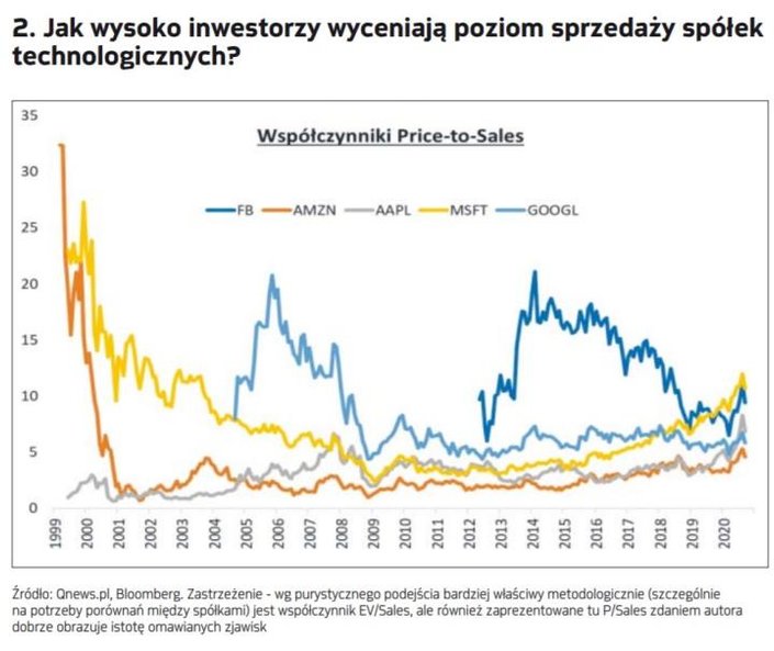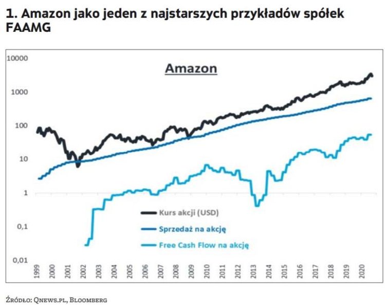 Zacznijmy od pozytywów. Wystarczy już rzut oka na historyczne i bieżące dane finansowe, by stracić wszelkie wątpliwości co do wzrostowego charakteru FAAMG. Każda ze spółek z tego grona dowiodła na przestrzeni lat, że potrafi dynamicznie i co więcej dość stabilnie powiększać przychody ze sprzedaży. I chodzi tu nie tylko o ostatnich kilka lat. Niektóre spośród FAAMG istniały już w czasach bańki internetowej z przełomu wieku. I każda z nich od tego czasu w imponującym stopniu powiększyła sprzedaż. Przykładowo od końca 1999 roku Microsoft zwiększył przychody na akcję prawie 9 razy, Apple niemal 39 razy, a Amazon... 130 razy. Oczywiście wraz ze wzrostem skali działalności tych gigantów coraz trudniej będzie utrzymać historyczne tempo rozwoju, niemniej historyczne dokonania zdecydowanie dobrze o nich świadczą.