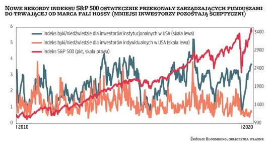 Jak to często bywa, spadki dosięgnęły inwestorów w momencie, gdy zaczęli oni nabierać coraz większej pewności co do kontynuacji trendu wzrostowego (przynajmniej profesjonalni gracze, bo mniejsi, ale doświadczeni, wciąż wyglądają na nieprzekonanych) (wykres 1). W sierpniu zarządzający funduszami na całym świecie uznali wreszcie, że trwające od końca marca zwyżki głównych indeksów nie są jedynie korektą w bessie, ale mogą być uznane za pełnoprawną falę wzrostową w niedokończonej wciąż hossie. Ustanowienie w ostatnich dniach wakacji nowego rekordu przez indeks S&P 500 stało się formalnym potwierdzeniem wizji podzielanej przez coraz liczniejszą rzeszę uczestników rynku.