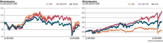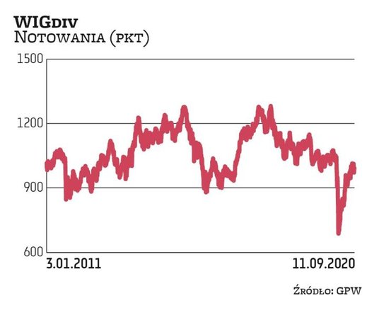 Od początku roku indeks WIGdiv, zrzeszający obecnie 30 emitentów regularnie dzielących się zyskiem (warunkiem przynależności jest co najmniej pięcioletni, nieprzerwany choćby w jednym roku, dorobek regularnych wypłat i obecność w indeksie WIG20, mWIG40 albo sWIG80), stracił 5,8 proc. To nieco lepszy rezultat niż WIG, który w tym czasie jest 12,6 proc. pod kreską, i wyraźnie lepszy wynik niż 17,4-proc. strata WIG20 Total Return (indeks blue chips w wersji dochodowej). Można więc uznać, że WIGdiv – zgodnie z teoretyczną cechą spółek dywidendowych (większa stabilność i mniejsza zmienność notowań) – spełnił swoje zadanie jako portfela spółek bardziej odpornych na zawirowania rynkowe. Jednak problemy są w długim terminie. Tu lepiej wypada szeroki rynek, być może to efekt negatywnych cech spółek dywidendowych, czyli mniejszego wzrostu i rozwoju (ale pewien wpływ na wyniki mogła mieć zmiana metodologii z 2016 r.). Licząc od końca 2010 r., czyli od powstania WIGdiv, do teraz wskaźnik ten stracił 2,5 proc. w porównaniu z 8-proc. wzrostem WIG. Licząc od końca 2010 r. do końca 2019 r., stopa zwrotu WIG jest aż o 17 pkt proc. wyższa niż WIGdiv, na koniec 2018 r. o prawie 15 pkt proc., na koniec 2017 r. o 13 pkt proc., na koniec 2016 r. o ponad 5 pkt proc. Tylko w pierwszych czterech latach od końca 2010 r. WIGdiv był lepszy od szerokiego rynku (o kilka pkt proc.). MR