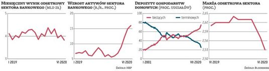Jednak raporty za II kwartał pokazują, że wynik odsetkowy czasami zaskakiwał pozytywnie. Ubytek w tym okresie nie był tak duży, jakiego oczekiwano, biorąc pod uwagę podawane przez same banki w maju i czerwcu szacunki wpływu cięcia stóp na ten rezultat, co sugeruje, że były one zbyt pesymistyczne lub, co mało prawdopodobne, fatalne będzie drugie półrocze pod tym względem. Dołek wyniku odsetkowego powinien nastąpić w III kwartale, ale część banków wskazuje, że negatywny wpływ obniżek stóp procentowych na wyniki może być nieco mniejszy, niż wcześniej oszacowały. Wynika to z szybszego i głębszego, niż oczekiwano, obniżenia kosztów finansowania, a do tego wolumeny kredytowe nie były aż tak bardzo słabe, jak oczekiwano na początku pandemii. Dodatkowo pomogła nadpłynność, wspierana działaniami banku centralnego i stymulacją fiskalną, która pompowała wartość aktywów odsetkowych. Tylko przez kwartał łączne aktywa sektora urosły o blisko 160 mld zł, czyli 7,5 proc., do 2,27 bln zł na koniec czerwca. Jednak odpowiadał za to głównie wzrost instrumentów dłużnych (o 184 mld zł, czyli 37 proc.), a nie kredytów (skurczyły się o 33 mld zł, czyli 2 proc.).