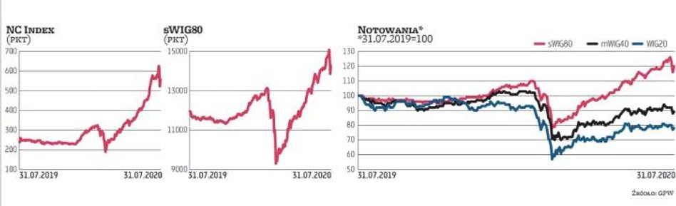 NCIndex od początku roku zyskał 137 proc. (w tym czasie sWIG80 urósł o 19 proc., ale mWIG40 stracił 9 proc., a WIG20 spadł o 17 proc.). – Od szczytu z 2008 r. NCIndex spadł o 85 proc. i po 230-proc. odbiciu z dołka w marcu 2020 r. zniósł blisko prawie 40 proc. spadków od 2007 r. Indeks próbuje więc odreagować blisko 12-letnią słabość. Warto dodać, że wartość miesięcznych obrotów na NC w lipcu wyniosła blisko 2,1 mld zł wobec zaledwie zazwyczaj 0,05–0,10 mld zł w latach 2008–2019. Małe spółki były jedną z ofiar awersji do ryzyka, mniejszej płynności czy mniejszej transparentności. Natomiast w obliczu poszukiwania ryzyka zyskują najbardziej – mówi Sobiesław Kozłowski, dyrektor departamentu analiz i doradztwa w Noble Securities.