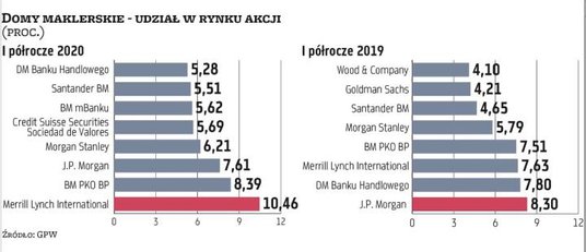 Najlepszym tego przykładem jest DM Banku Handlowego, który specjalizuje się w obsłudze inwestorów zagranicznych i instytucjonalnych. Jeszcze w I połowie 2019 r. firma była na drugim miejscu pod względem aktywności na rynku akcji z udziałem na poziomie 7,8 proc. Po I półroczu 2020 r. zajmuje ósme miejsce, mając 5,28 proc. udziałów w rynku. Czy więc oglądamy zmierzch dawnej potęgi? Słabsza postawa tego domu maklerskiego zbiegła się w czasie z ruchami kadrowymi w tym przede wszystkim z odejściem Pawła Cylkowskiego, który przez wiele lat obsługiwał największych klientów biura. – Na udziały w rynku patrzymy w dłuższej perspektywie. Naszym celem jest utrzymanie silnej pozycji w obrotach na rynku akcji – deklarował w kwietniu na łamach „Parkietu" Patrycjusz Wójcik, prezes DM Banku Handlowego.