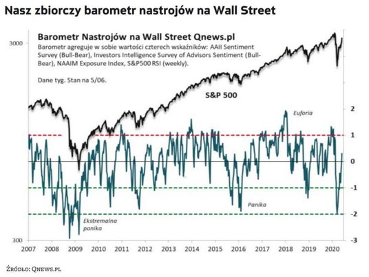 Zacznijmy od tego, jaki był obraz nastrojów przed koronawirusowym krachem. Jeśli chodzi o Wall Street, był to obraz bardzo dobrego humoru uczestników rynku. Pokazuje to nasz zbiorczy barometr, który znalazł się wtedy w odległości ponad jednego odchylenia standardowego od historycznej średniej, co świadczyło o niezwykle silnym optymizmie, spotykanym średnio raz na kilka lat.