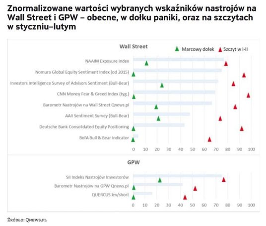Według większości miar inwestorzy byli w zbyt dobrych humorach na początku roku, w trakcie krachu paniczny strach stanowił zaś zgodnie z odwieczną zasadą okazję do kupowania. Od marca wskaźniki pokazują stopniową poprawę humorów.