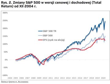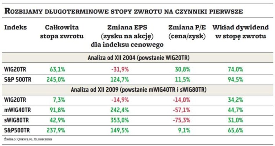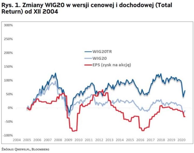 Można w pewnym sensie powiedzieć, że WIG20 to niejako „koślawy" substytut obligacji korporacyjnej o wysokim ryzyku („high yield"), bo w długim okresie jego wartość nominalna (czyli indeks cenowy) właściwie stoi w miejscu (a po drodze ulega gwałtownym, spekulacyjnym fluktuacjom), zaś całe zyski inwestorów wynikają z wypłacanych „odsetek" (czyli dywidend).
