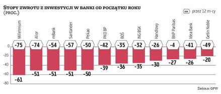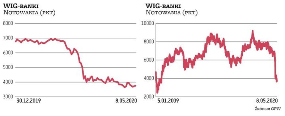 Banki nie załapały się na odbicie notowań na GPW, które nastąpiło po głębokiej przecenie rozpoczętej w połowie lutego. O ile WIG20 odrobił połowę poniesionych wtedy strat i od początku roku jego notowania są 25 proc. pod kreską, o tyle WIG-banki w kwietniu pogłębiał spadki i teraz jest blisko 45 proc. na minusie, licząc od początku roku. Teraz bankowy indeks notowany jest na poziomie 3737 pkt, najniższym od połowy kryzysowego 2009 r.