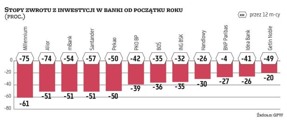 Na spadek notowań banków złożyło się nie tylko oczekiwane pogorszenie wyników, ale i obniżenie wskaźników wycen. C/WK dla indeksu WIG-banki to teraz tylko 0,45, najniżej w historii (w kryzysie z lat 2008–2009 obniżył się maksymalnie w okolice 0,7). Teraz jednak ROE, czyli zwrot z kapitałów sektora, jest niższy nie tylko ze względu na dużo niższe stopy procentowe niż wtedy, ale i większe wymogi kapitałowe (mimo ostatniego poluzowania wymogów banki wciąż mają dużo kapitału, bo nie mogą go wypłacić, więc w obliczu pogorszenia wyników oznacza to dalszą presję na spadek ROE).