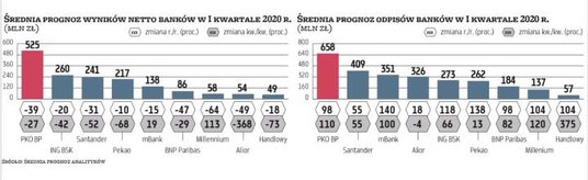 Część banków już podała tzw. profit warning, czyli ostrzeżenia przed pogorszeniem kwartalnego wyniku. Zrobiły tak m.in. PKO BP, mBank, BNP Paribas czy Millennium. Przede wszystkim banki informowały o spadku wyniku odsetkowego z powodu cięcia stóp procentowych łącznie o 100 pkt baz. (50 pkt baz. w połowie marca i 50 pkt baz. na początku kwietnia), do 50 pkt baz. obecnie. Ten czynnik jednak będzie miał marginalny wpływ na wynik odsetkowy w I kwartale (według prognoz łącznie wyniósł 10,5 mld zł, więcej o 9 proc. niż rok temu i 1 proc. niż w poprzednim kwartale); będzie miał znaczenie w kolejnych miesiącach i obniży zysk netto banków po około 20 proc.