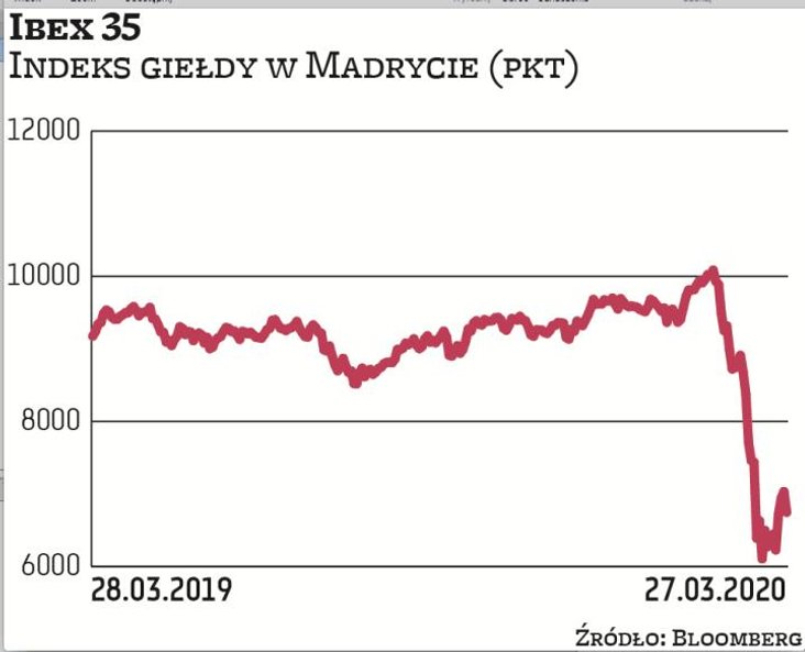 Cios, jaki otrzymała hiszpańska gospodarka, trudno jest oszacować. Dane PMI o koniunkturze w przemyśle i sektorze usług w marcu poznamy dopiero w przyszłym tygodniu. Można się jednak spodziewać, że spadki będą wskazywały na głęboką recesję. Dane o PKB za I kwartał na pewno będą bardzo kiepskie, podobnie jak za cały rok. Analitycy the Centre for Economics and Business Research prognozują, że PKB Hiszpanii skurczy się w 2020 r. o 8 proc. (W 2009 r., czyli w czasie ostatniej globalnej recesji, spadł on o 3,6 proc. W czasie wojny domowej z lat 1936–1939 zmniejszał się on średnio o 6,7 proc. rocznie). Są również prognozy bardziej ostrożne. Na przykład analitycy Coface spodziewają się spadku hiszpańskiego PKB o 1,7 proc. w tym roku.