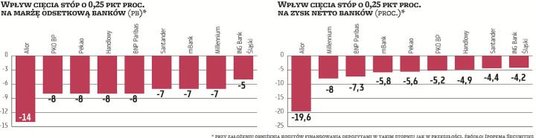 Wpływ cięcia stóp procentowych na pogorszenie wyniku odsetkowego jest tym wyższy, im większy jest udział bieżących depozytów (nisko lub wcale nieoprocentowanych) w całości środków klientów zdeponowanych w banku. Dzieje się tak, bo zmiana oprocentowania depozytów bieżących w mniejszym stopniu jest uzależniona od zmian stóp RPP. Dlatego takim bankom trudniej jest zareagować i w odpowiednim stopniu ściąć koszty finansowania depozytami (ze względu na duży udział bieżących spora część depozytów takiego banku już jest prawie nieoprocentowana). To oznacza, że największe banki z dużym udziałem depozytów bieżących mogą w wyniku odsetkowym odczuć cięcie najbardziej. Mniejsze zaś, które nie mają dużo wiernych klientów z trwałą relacją, przez co mają relatywnie sporo depozytów terminowych, w mniejszym stopniu odczują w wyniku odsetkowym cięcie stóp, bo mają więcej przestrzeni na obronę marży poprzez obniżenie stawek depozytów, głównie terminowych. Zwykle banki starają się jak najszybciej ciąć oprocentowanie depozytów w razie obniżenia stóp i oddalić moment ich podnoszenia po zwiększeniu stawki referencyjnej przez RPP. Teraz warunki im sprzyjają ze względu na nadpłynność – banki nie muszą konkurować ceną o depozyty, bo tych przybywa szybciej niż kredytów.