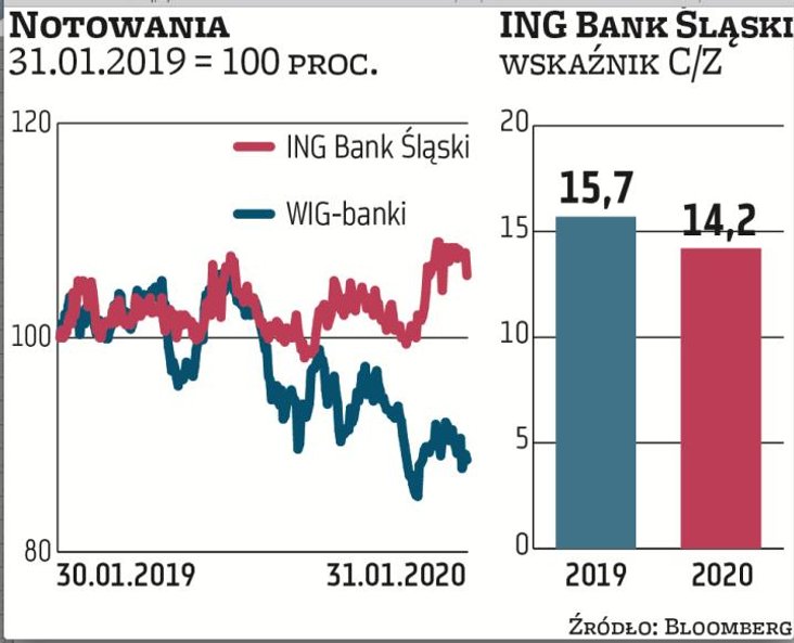 ING Bank Śląski jest jednym z niewielu kredytodawców z GPW, którego 12-miesięczna stopa zwrotu jest dodatnia (7,4 proc.). To najbardziej rentowny bank, więc i najwyżej wyceniany. Michał Fidelus, analityk DM BDM, prognozuje, że w tym roku tempo poprawy zysku netto może przyśpieszyć do 14 proc. z 10 proc. w 2019 r. Ocenia jednak, że wskaźniki wyceny (13,9 C/Z i 1,6 C/WK), stanowiące odpowiednio 25-proc. i 60-proc. premię do mediany, są adekwatne i potencjał do wzrostu notowań jest niewielki. – Oczekiwana poprawa wyników tego banku jest już raczej w cenach, musiałaby nadejść poprawa wycen całego sektora, aby ING BSK na tym skorzystał, bo jest dość drogi i nie będzie się w tym roku raczej pozytywnie wyróżniał pod względem notowań na tle innych banków. Słabości kursu też się nie spodziewam, bo dobre spółki są w cenie – mówi Łukasz Jańczak, analityk Ipopemy. – Moim zdaniem najsilniejsze w tym roku będą właśnie ING BSK i Pekao, których wyniki nie będą pod presją ryzyka prawnego – dodaje Marcin Materna, szef działu analiz Millennium DM.