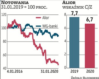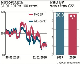 – Wydaje mi się, że po ostatnich spadkach cen akcji banków pole do dalszej deprecjacji jest już niewielkie. Spodziewam się raczej trendu horyzontalnego na notowaniach większości spółek sektora, poza takimi jak ING BSK, Pekao, Alior czy BNP Paribas – mówi Marcin Materna, dyrektor działu analiz w Millennium DM. Roczna stopa zwrotu z akcji PKO BP to -10,6 proc., indeks WIG-banki spadł o 13,2 proc. PKO BP – największy i najbardziej ainwestorów zagranicznych jako fundament do budowy ekspozycji na silny polski wzrost gospodarczy. Dużo będzie więc zależeć od ich postrzegania naszego rynku. – Kluczowa dla PKO BP będzie kwestia franków, kurs będzie z tego powodu pod presją, ale może być zmienny, bez konkretnego trendu, bo w tym roku sprawa tych kredytów dla sektora się nie wyjaśni. PKO BP jest relatywnie tanio wyceniany, biorąc pod uwagę wyniki nieobciążone frankami, które mogą się w tym roku lekko poprawić – ocenia Łukasz Jańczak, analityk Ipopemy. Nie będzie to już jednak aż tak dobre tempo jak w 2019 r., gdy zysk netto nieobciążony rezerwą frankową mógł urosnąć o około 20 proc.