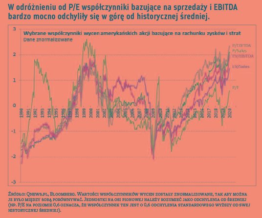 O ile P/E jest relatywnie niewysoko na tle swojej historii (ok. 0,6 tzw. odchylenia standardowego powyżej średniej), to wszystkie pozostałe wskaźniki są o wiele wyżej. Rekordzistami są P/EBITDA i P/Sales, które są już ponad dwa odchylenia standardowe od średniej. Tak ekstremalnie wysoko nie są co prawda uznawane czasem za bardziej poprawne metodologicznie (bo uwzględniają poziom zadłużenia) wskaźniki EV/EBITDA i EV/Sales, ale i one są już w okolicach rekordów z czasów bańki internetowej.